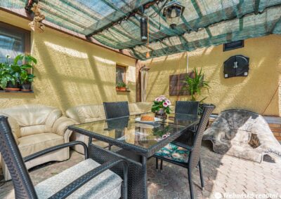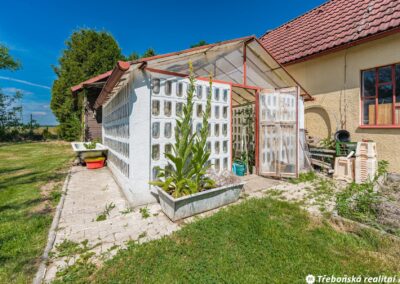 Součástí pozemku je předzahrádka se vstupem do sklípku. Na dvoře se nachází pergola, která poskytuje příjemné místo k posezení. Zahrada je rozdělena na užitkovou i odpočinkovou část najdeme zde ovocný sad, pěstební záhony, skleník a praktický zahradní domek.