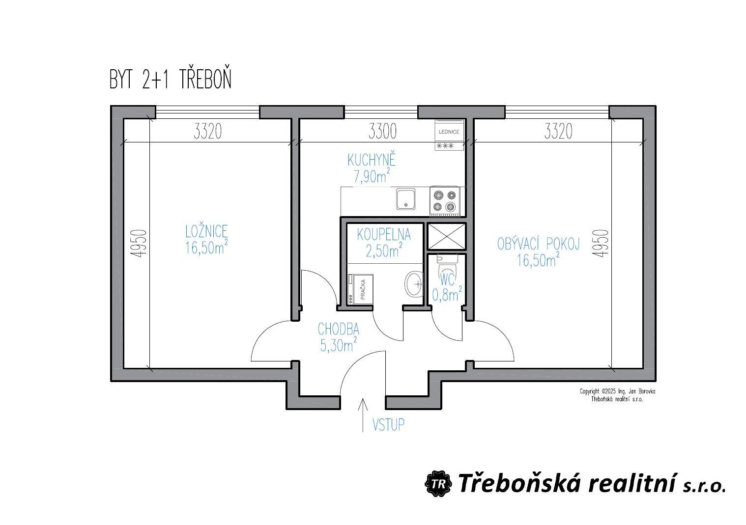 Byt o celkové výměře 50 m2 je situován ve 3. patře zděného domu. Skládá se z chodby, ze které jsou jednotlivé vstupy na samostatnou toaletu, do koupelny, obývacího pokoje, kuchyně a do ložnice. Dispoziční řešení a velikosti jednotlivých místností naleznete na přiloženém půdorysu.