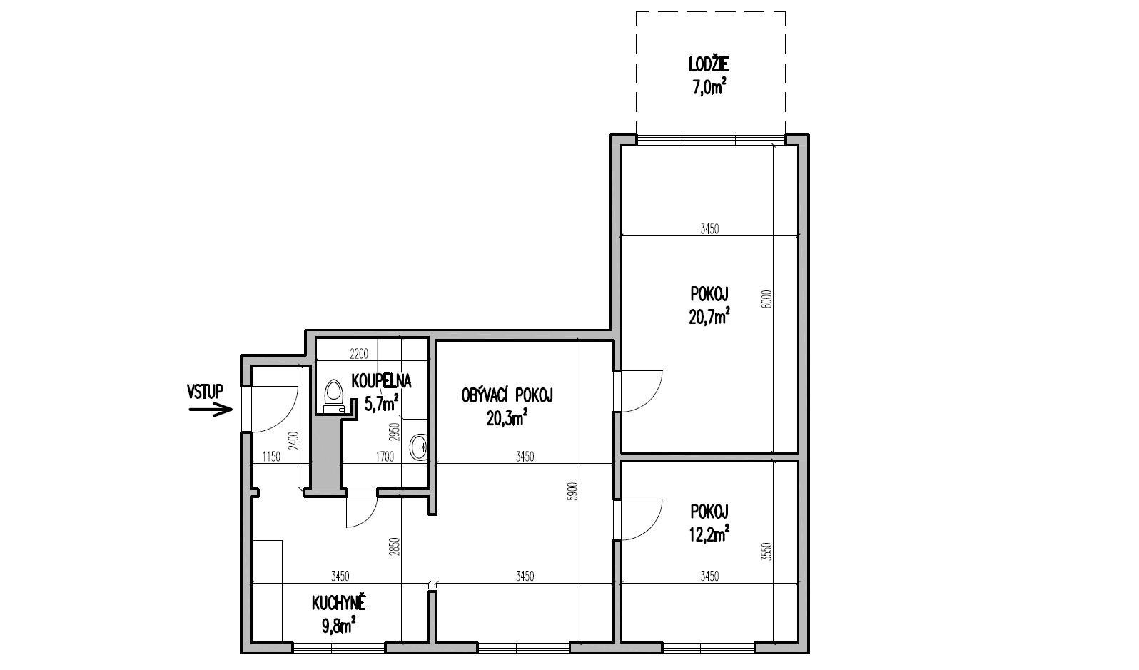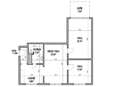 Byt o celkové výměře 72 m2 se nachází v přízemí bytového domu a skládá se z chodby, ze které je vstup do kuchyně s jídelnou. Z kuchyně je dále vstup do koupelny a obývacího pokoje. Obývací pokoj je průchozí do pokoje a ložnice, ze které je vstup na lodžii. K bytu je možné užívat i sklepní kóji a společnou kolárnu.
