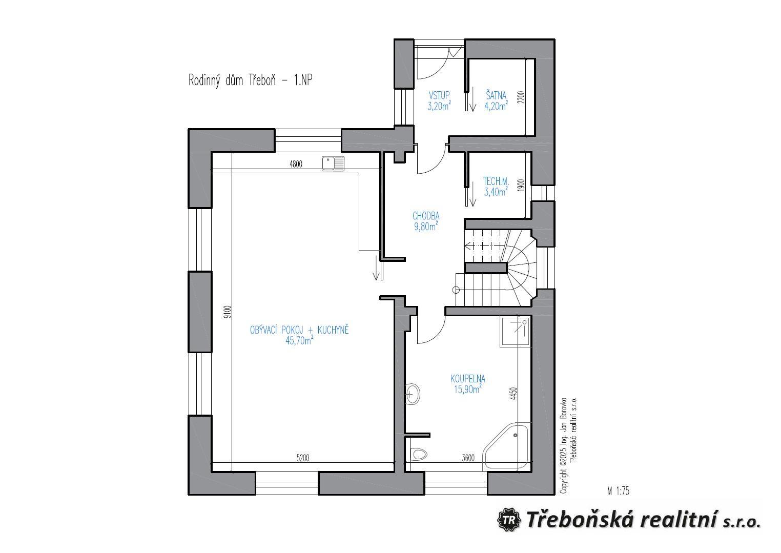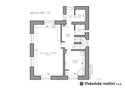 – Přízemí: předsíň, šatna, chodba, koupelna s WC, technická místnost, velkorysý obytný prostor s kuchyní